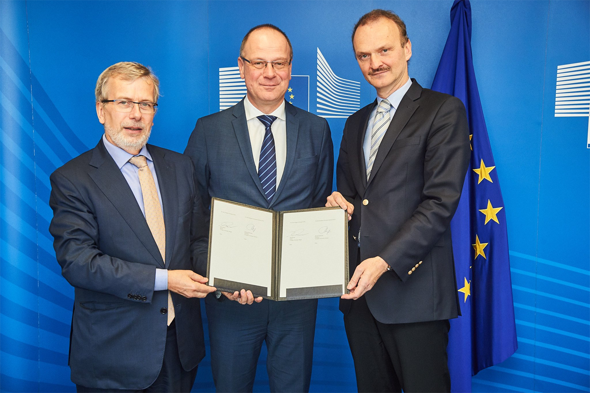EUI President Renaud Dehousse, Commissioner Tibor Navracsics, and College of Europe Rector Jörg Monar with the new framework agreement (Photo courtesy European Commission)