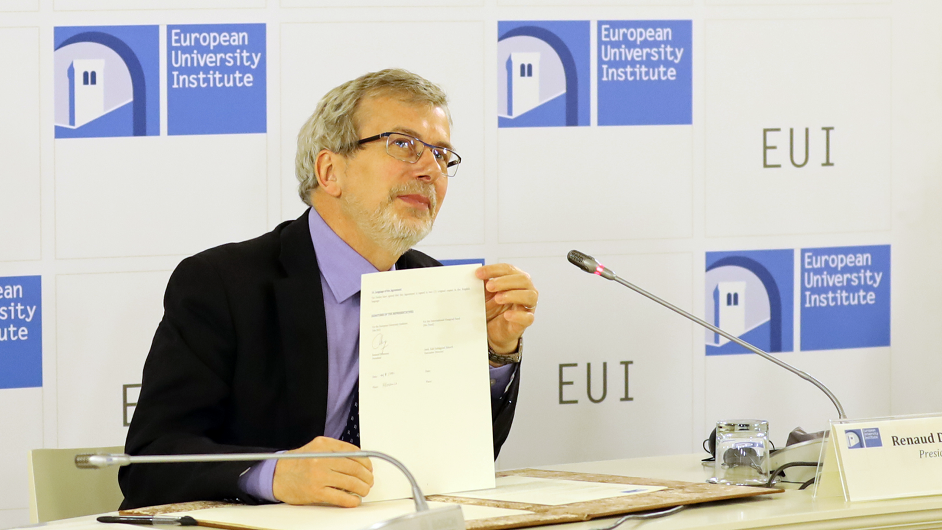 EUI President Professor Renaud Dehousse demonstrates the signed agreement with IVF partners.