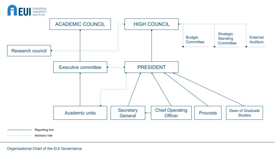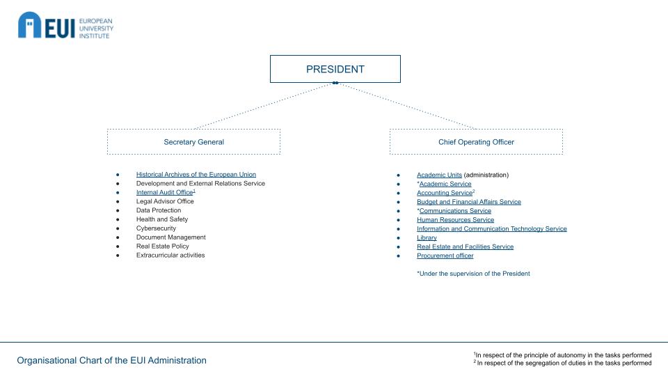 The EUI Administration strives to provide effective and efficient support services that are tailored to the needs of the academic community and that contribute constructively to the implementation of the Institute's strategy.