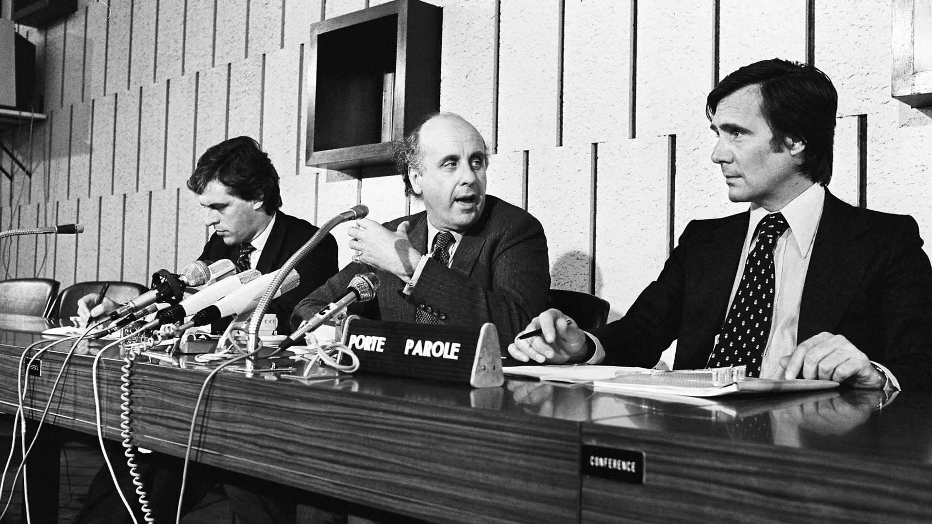 Photo: Willy Hélin, membre du groupe du Porte-parole de la CCE, Etienne Davignon, Manuel Santarelli, porte-parole de la CCE (de gauche à droite). Source: EC - Service audiovisuel © Communautés européennes, 1980