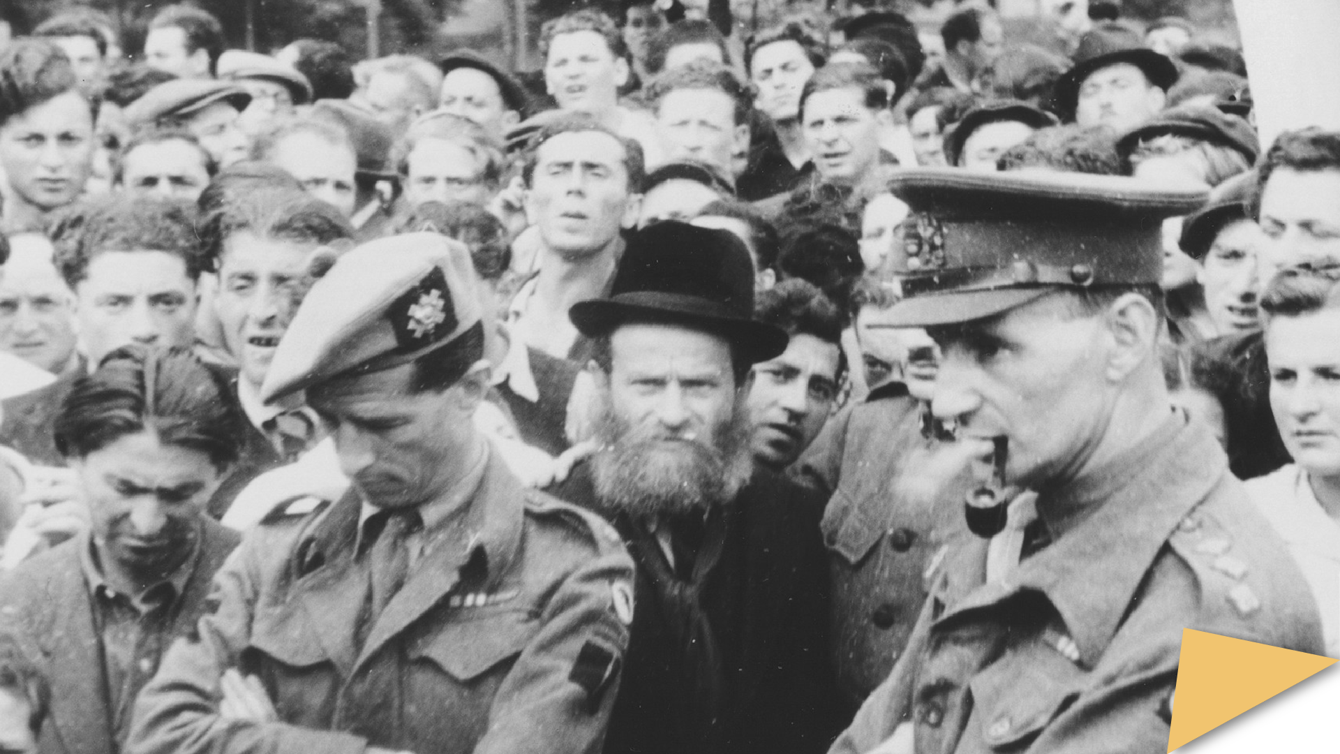 Photo credits: A crowd of Jewish DPs stand behind British soldiers at a ceremony or demonstration in the Bergen-Belsen displaced persons camp. [United States Holocaust Memorial Museum, courtesy of Hilde Jacobsthal Goldberg]