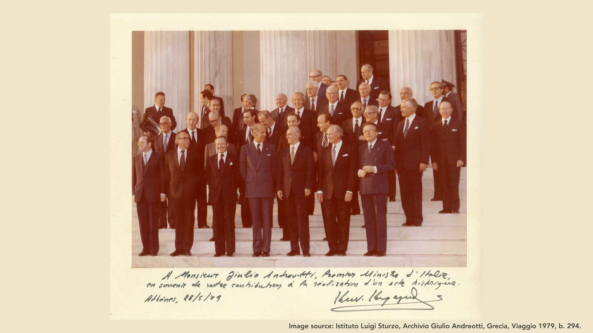 Feature image: Group photo with inscription to Italy's Prime Minister Giulio Andreotti by Greek President Konstantinos Karamanlis, following the official signing of the Treaty of Accession of Greece to the European Communities. Source: Istituto Luigi Sturzo, Archivio Giulio Andreotti, Grecia, Viaggio 1979, b. 294.
